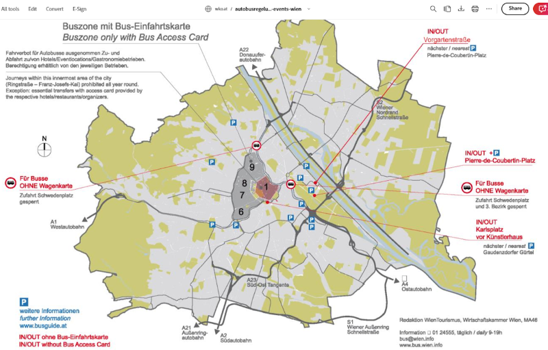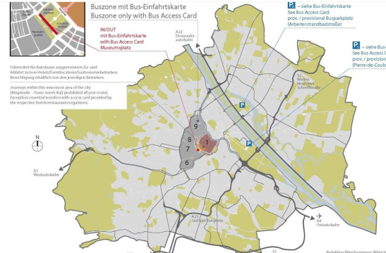 Bécs Óvárosába egész évben csak engedéllyel lehet behajtani. Ezt csak az ottani úticélok üzemeltetői szerezhetik be, és adják a hozzájuk tartó turistabuszoknak.