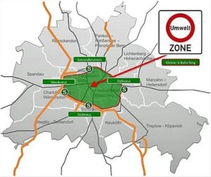 A gépjárművek környezetvédelmi besorolására Németországban létrehoztak egy egységes keretrendszert. Minden jármű a kibocsátása alapján matricát kap (piros, sárga, zöld), amit a szélvédőre belülről kell felragasztani. A városok döntő részébe csak zöld matricával lehet behajtani.