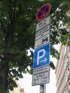 Utascserélő helyek jelzése: Megállni tilos tábla, alatta „Ein- und Aussteigen frei“ feliratú kiegészítő tábla; Forrás: NuBerlin
